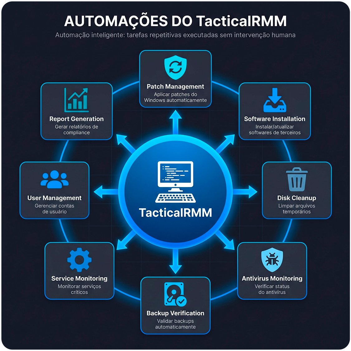 O TacticalRMM oferece 8 categorias principais de automação ilustradas na imagem acima. Todas essas tarefas podem ser executadas sem intervenção humana, liberando sua equipe para atividades mais estratégicas e gerando economia significativa de tempo.
