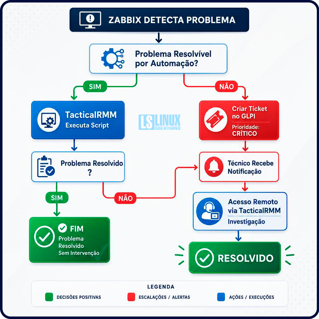 No diagrama abaixo, você pode ver um fluxo com a integração entre Zabbix, TacticalRMM e GLPI funcionando na prática. O sistema tenta resolver automaticamente; se não conseguir, escala para um técnico com todos os dados necessários. Isso garante que problemas simples sejam resolvidos em minutos sem intervenção humana, enquanto problemas complexos recebem atenção técnica imediata.