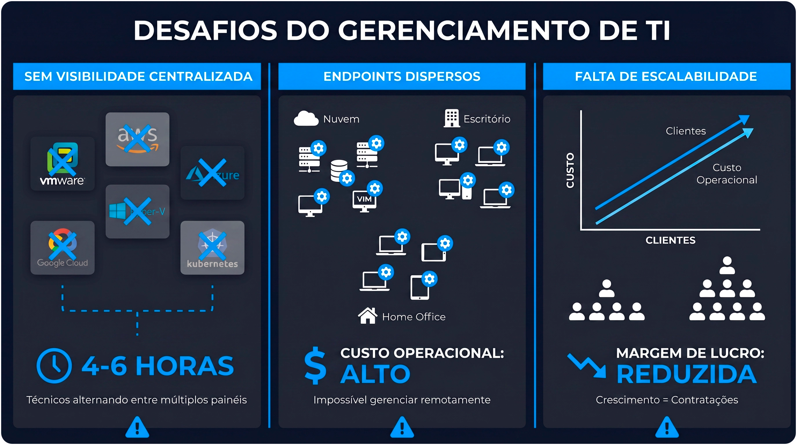 Gerenciar a TI de uma única empresa já é um desafio considerável. Gerenciar a TI de dezenas de empresas diferentes, cada uma com sua própria arquitetura, políticas de segurança e legado tecnológico, é uma tarefa hercúlea. As MSPs frequentemente esbarram em três grandes obstáculos operacionais, ilustrados na imagem abaixo.