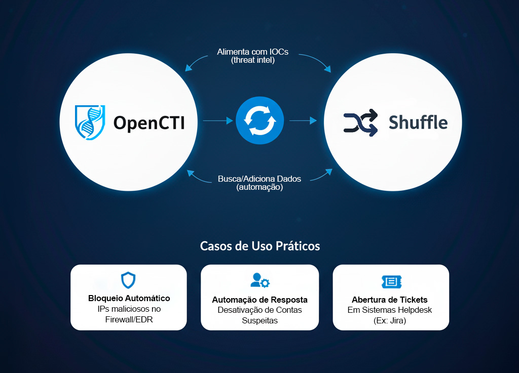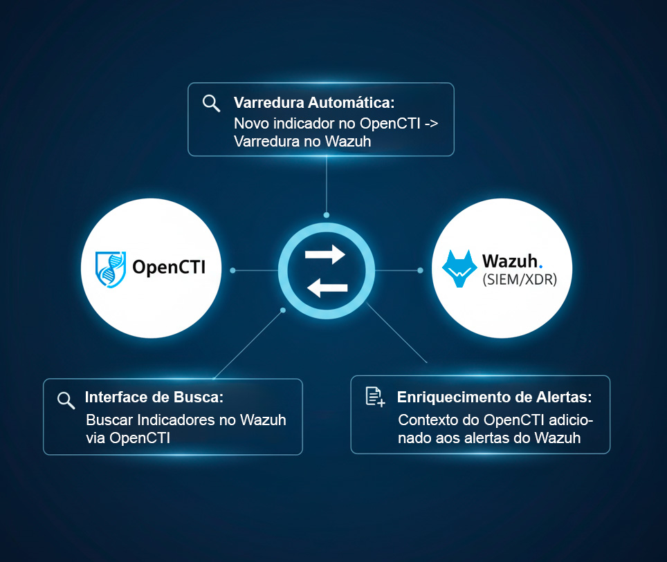 O OpenCTI pode ser integrado a ferramentas como Wazuh (SIEM e monitoramento de segurança) para analisar e correlacionar eventos em tempo real, além de automações via Shuffle, que agilizam respostas e processos repetitivos. Essas integrações promovem maior agilidade e precisão nas respostas a incidentes, aumentando a resiliência do ambiente de TI.